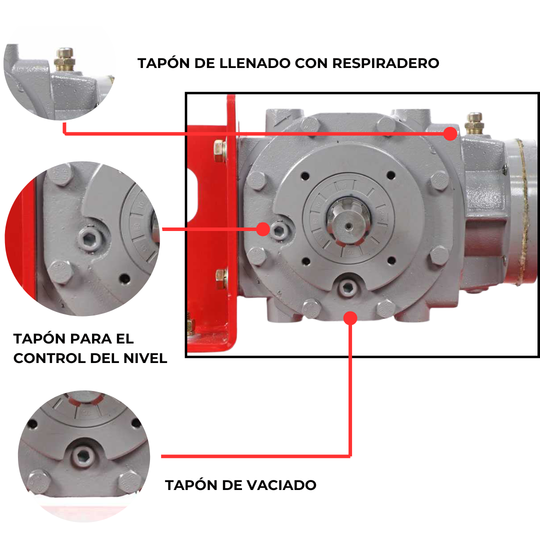 • Tapón para el control del nivel: se encuentra en posición central y permite comprobar fácilmente el nivel de aceite. Es importante asegurarse de que el lubricante alcance siempre la altura correcta para garantizar una lubricación adecuada de los engranajes y evitar daños.