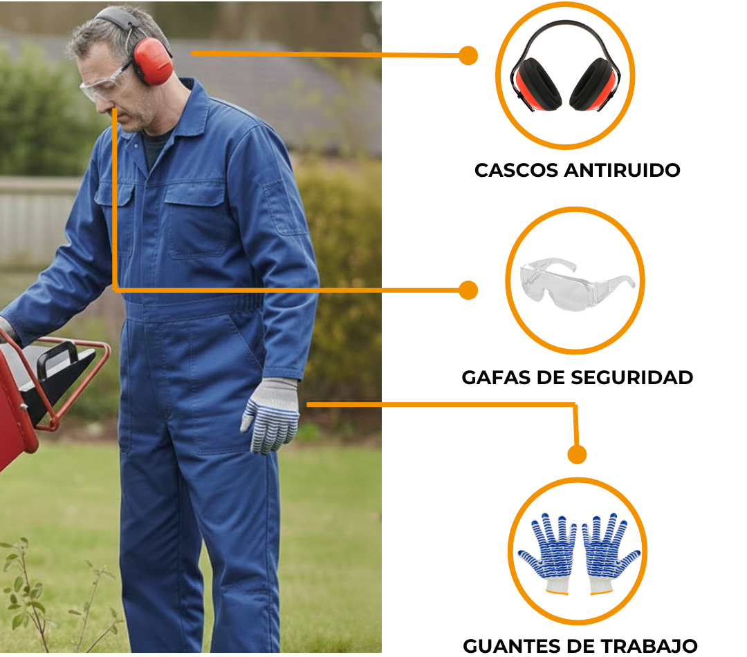 - Se recomienda encarecidamente la protección auditiva. La biotrituradora genera un ruido continuo que, con el tiempo, cansa y reduce la atención. Los cascos antiruido ayudan a mantener la concentración durante más tiempo, lo que permite percibir mejor las señales de la máquina, como las variaciones de ruido relacionadas con sobrecargas o atascos.